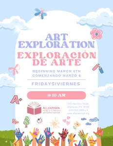 Join us Friday mornings at 10 am in the Children’s Area to play with a variety of art materials: paint, clay, chalk, and more!