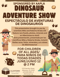 This presentation brought to you by scientists Mike and Roberta Straka will feature rare fossils, photos, minerals and an Albertosaurus skull! The event will take place on June 12th at 2 pm. For children of all ages!
